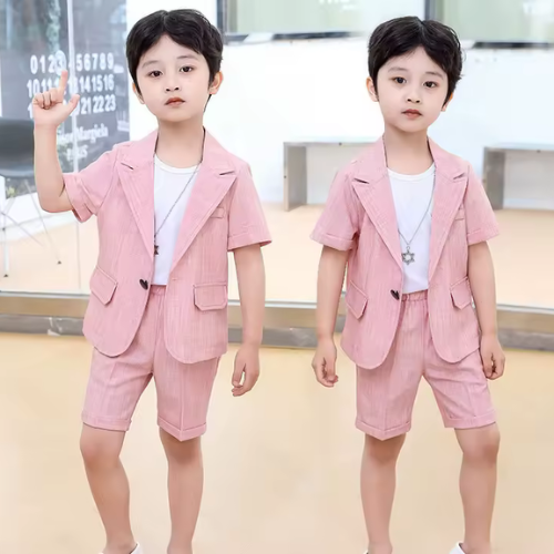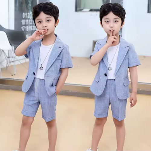 A stylish and comfortable 2-piece summer suit for baby boys, featuring a smart jacket and matching shorts. Perfect for birthdays, weddings, graduation ceremonies, parties, and photo shoots, this outfit gives kids a charming and fashionable look for any special occasion.