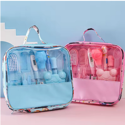 The kit typically includes important baby care tools such as a nose aspirator for clearing nasal congestion, baby nail trimmers for safe nail cutting, and other daily cleaning accessories that help maintain proper hygiene. Each item is designed with smooth edges and baby-friendly materials to ensure safe use on delicate skin and sensitive areas.