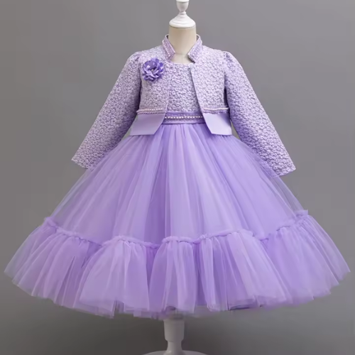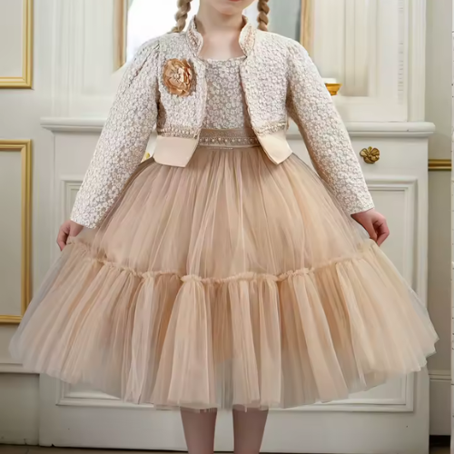 This fashionable dress set is perfect for birthday parties, family gatherings, school events, holiday celebrations, and special photo sessions. The elegant lace design and stylish coat combination create a timeless look that makes every little girl feel like a princess. It can easily be paired with cute shoes, hair accessories, or tights to complete the outfit.