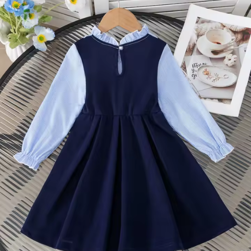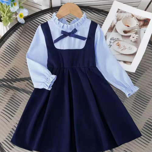 The Girls Navy Blue Pinafore Dress with Striped Long Sleeve Top and Bow Collar is a charming and fashionable outfit designed for comfort and style during the spring and autumn seasons. This beautiful clothing set includes a classic navy blue pinafore dress paired with a striped long sleeve top, creating a timeless and elegant look that is perfect for young girls.