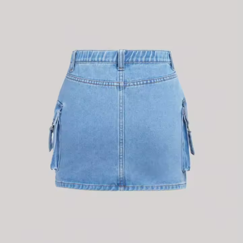 Designed with attention to both style and durability, the light wash denim material ensures long-lasting wear while maintaining its fashionable look. The classic denim color and cargo pocket details make this mini skirt a versatile piece that can be styled in many ways throughout different seasons.